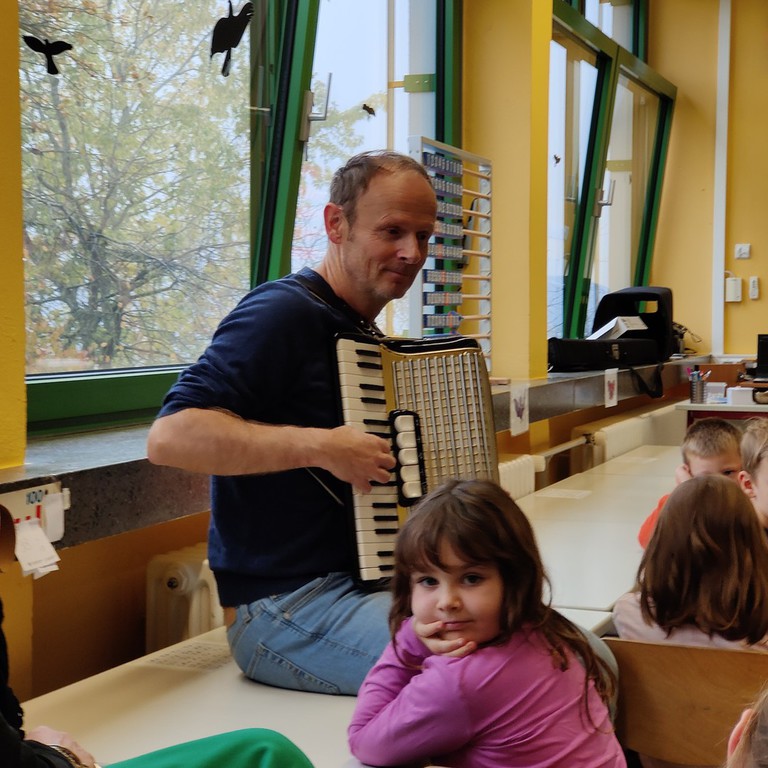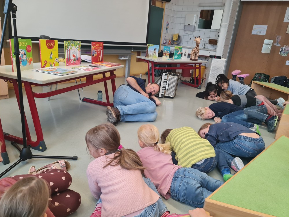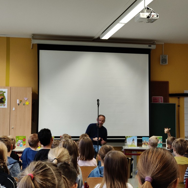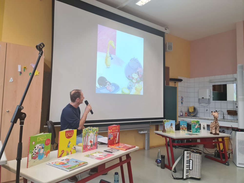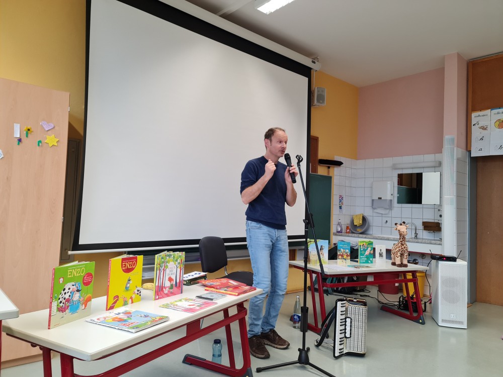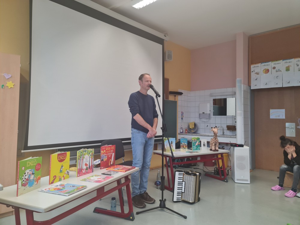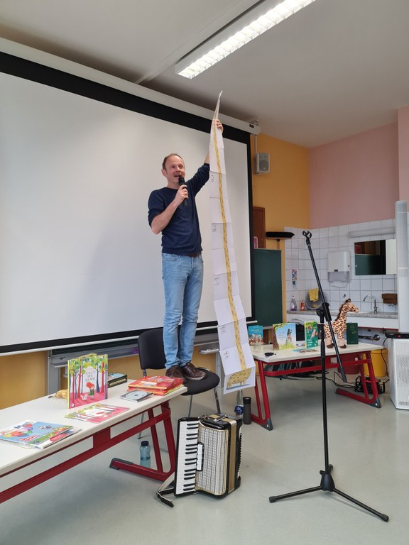 Wir Schüler mussten oft lachen. Alle haben den Autor gut verstanden. Er hatte auch ein Akkordeon dabei, mit dem er das Buch begleitete.