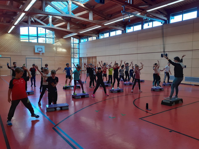 Im zweiten Teil wurde es für Manche ganz schön kompliziert, denn da haben wir alle Bewegungen hintereinander gesteppt mit fetziger Musik und Tempo!